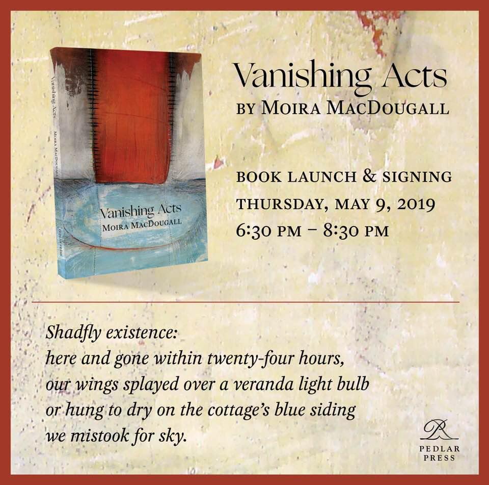I will be reading in support of Moira MacDougall who will be launching her new book, Vanishing Acts, Pedlar Press.