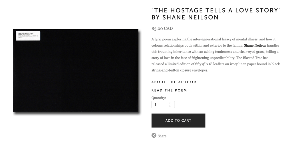 Released on Sept. 30, 2020: “The Hostage Tells a Love Story,” a long poem concerning intergenerational disability and, what else? Love. Order it here, but maybe take out a subscription from Kyle Flemmer instead, his work deserves support.